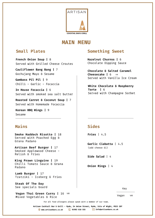 Artisan is a relaxed but elegant dining and drinking venue. Quality food is central to Artisan. Sharing platters, small plates and authentic fusion dishes are created from the best produce the Isle of Wight has to offer.